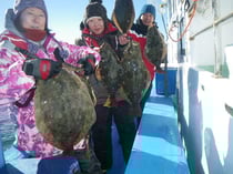 4.5キロ、3.8キロ、3.6キロ、3.5キロ、3.2キロ、3キロ、・・・1.2キロのヒラメを船中24枚!!2.5~3キロの良型ヒラメ主体でした。今後も期待しましょう。平日も大チャンスです。平日も毎日、大漁祈願してヒラメ釣りに出船します。ヒラメも人気の釣り物ですのでご予約お早めに。ヒラメ釣りは15名限定で毎日出船。皆様のお越しを心よりお待ちしています。ヒラメ:1~6枚 船中24枚(1.2~4.5キロ)