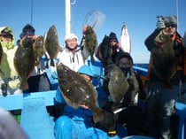 5.5キロ、5.2キロのヒラメを頭に9人で船中29枚!!5キロのヒラメを含み竿頭6枚!!アタリ多く、バラシあり。今がヒラメ釣り、大チャンスです!!14日(火)は休みで15日(水)からまた出船!!期待大!!平日も毎日出船でチャンスです。ヒラメも人気の釣り物ですのでご予約お早めに。ヒラメ釣りは15名限定で毎日出船。皆様のお越しを心よりお待ちしています。